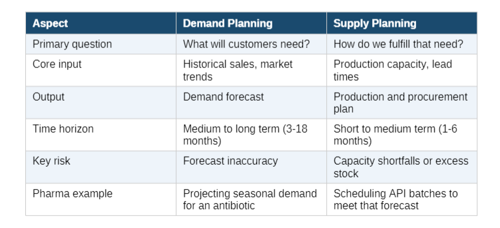 The table below compares demand planning vs supply planning across the dimensions that matter most for pharma operations teams.
